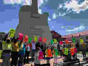 The slogan #FundourFutureNotGas is plastered across the signs protesters held up in front of Tamworths iconic Golden Guitar and is trending on social media.